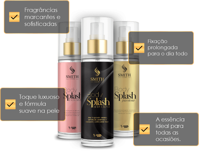 O Body Splash tem uma fórmula mais leve e refrescante, ideal para o dia a dia. Mas os da Smith Care se destacam por entregarem performance e elegância com qualidade de perfume importado.